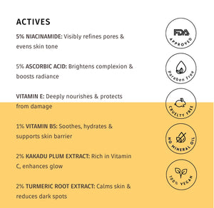 Aqua, Cocos Nucifera (coconut) Oil, Isopropyl Myristate, Vitamin B3 (niacinamide), 3-o-ethyl Ascorbic Acid, Glycerine, Stearic Acid, Curcuma Longa (turmeric) Root Extract, Terminalia Ferdinandiana Fruit Extract, Phenoxyethanol (and) Ethylhexylglycerin, Tocopherol (vitamin E), Panthenol (pro-vitamin B5), Perfume, Glyceryl Mono Stearate Se, Triethanolamine, Cyclopent- Asiloxane (and) Cyclohexasiloxane, Citrus Limon (lemon) Peel Extract, Steareth-20, Steareth-21, Sodium Gluconate, Carbomer.